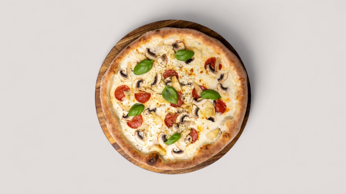 mit Creamy-Garlic-Soße, Käse, Artischocken, scharfer Peperoni Salami vom Rind, Champignons und Basilikum