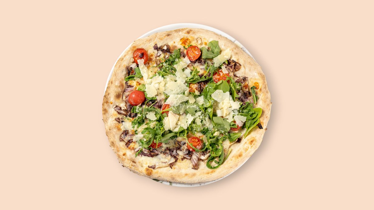 mit Radicchio, Gorgonzola, Kirschtomaten Ruccola, Parmesan, Knoblauch und Basilikum, ohne Tomatensoße