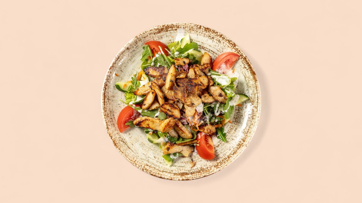 bunter Salatteller mit gebratenen Putenbruststreifen, in Joghurtdressing
