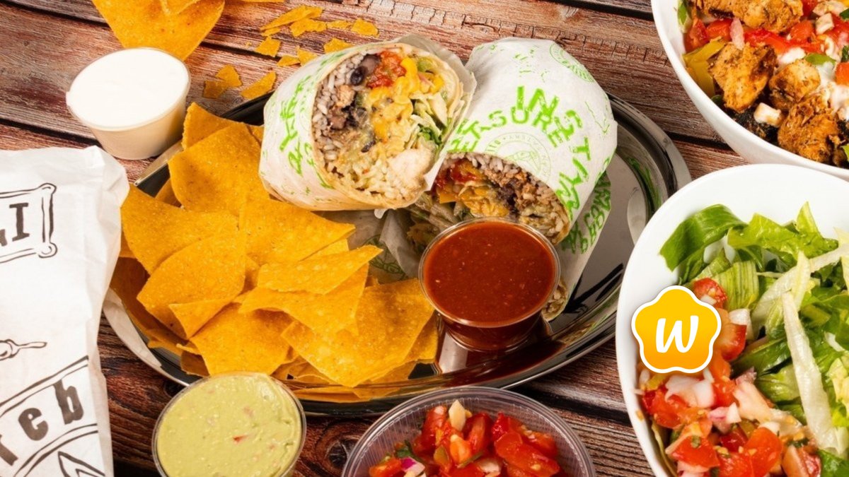 Mit Reis nach Wahl, hausgemachter Guacamole, schwarze Bohnen, Fajita Gemüse, Mango Salsa, von der Rolle-Salsa, Cheddar, Sour Cream und Romana Salat
