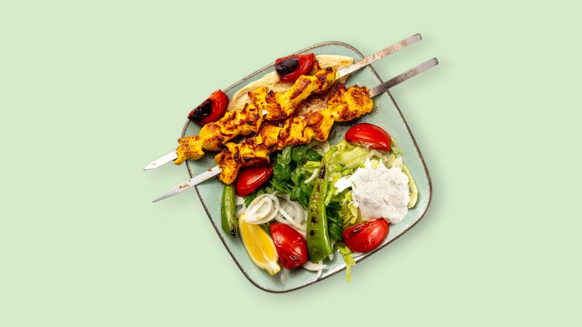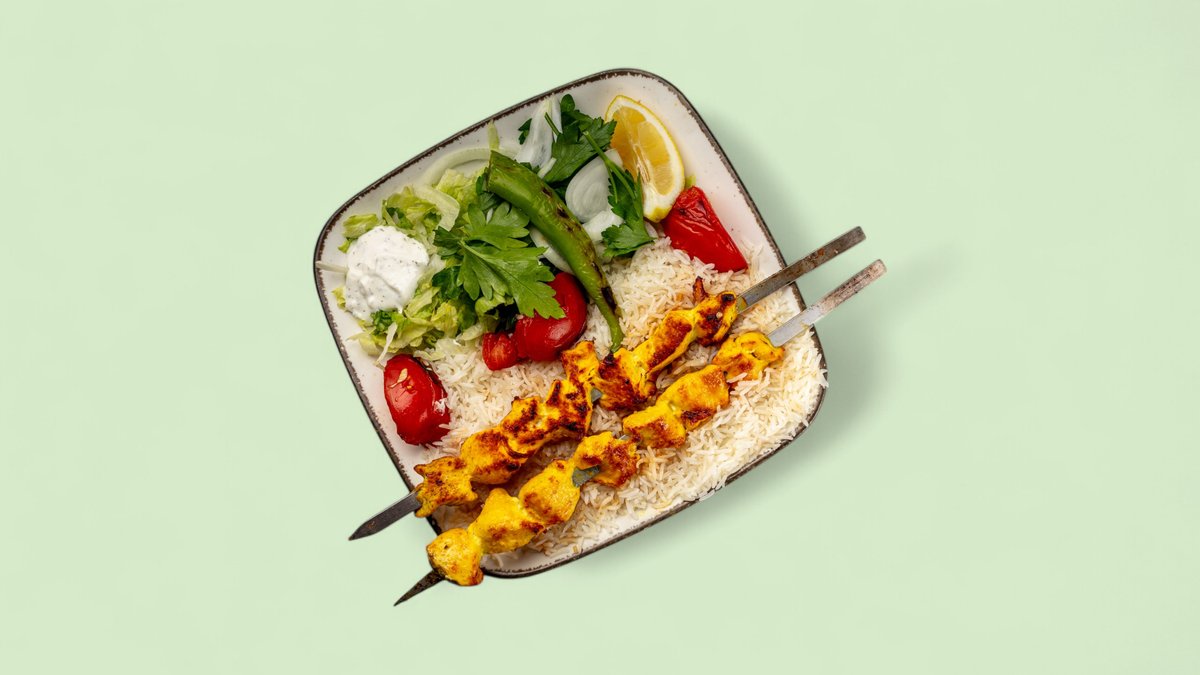 gegrillte Lammspieße mit Salat und Biryani, in einer Größe deiner Wahl serviert