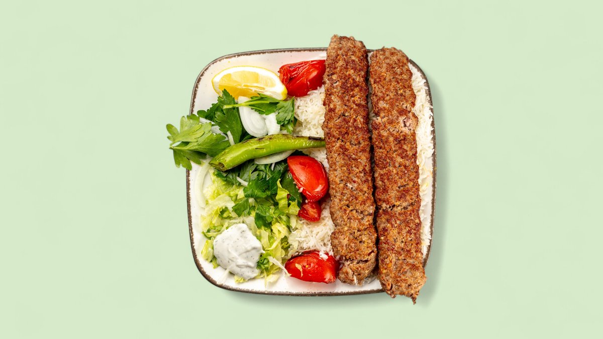 gegrillte Lammhackspieße mit Salat und Biryani, in einer Größe deiner Wahl serviert