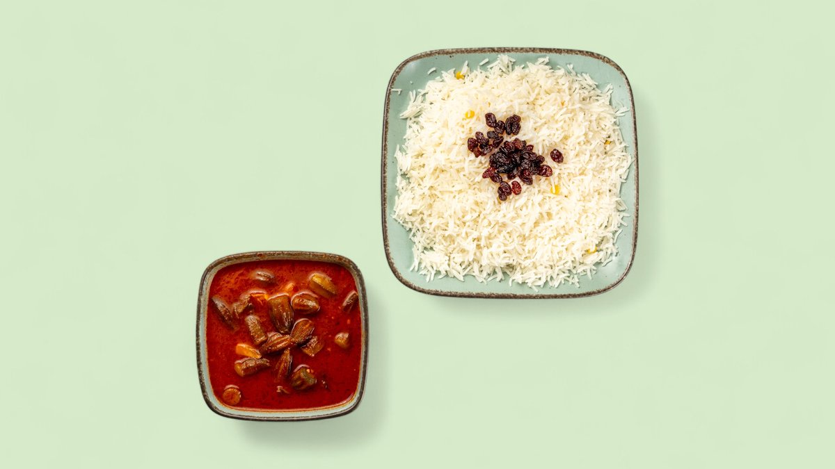 Reis mit Okrasoße und Salat