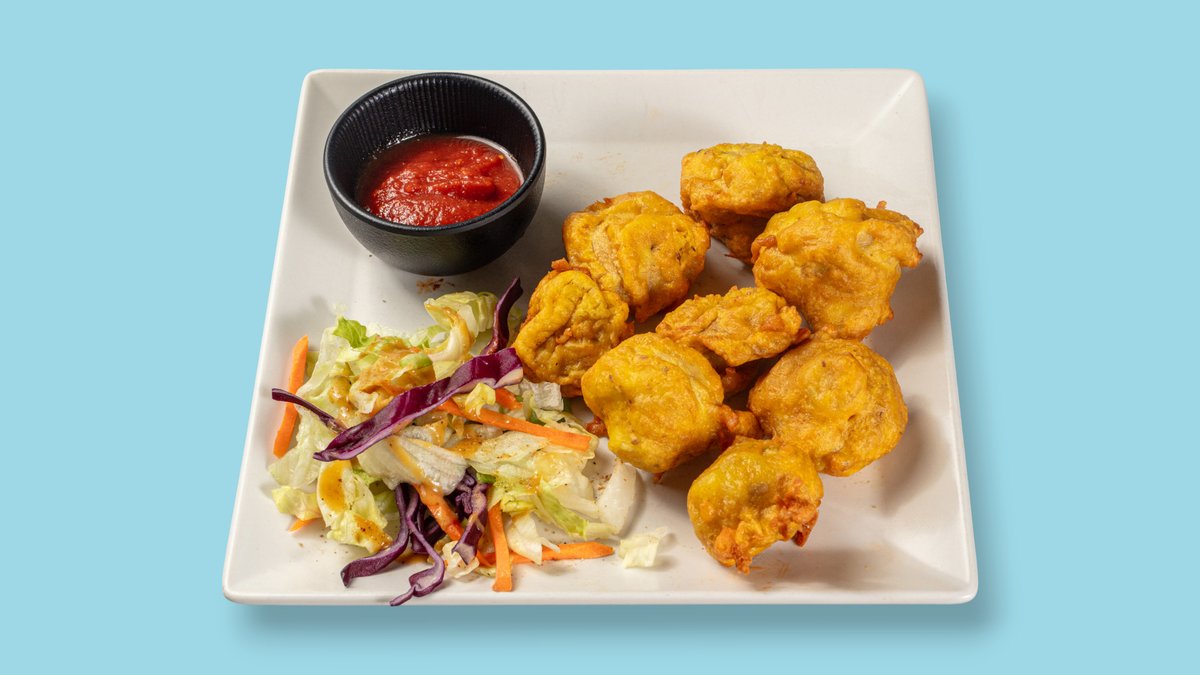 knusprig außen, saftig innen, goldbraun frittiert und serviert mit würziger Tomaten-Chutney