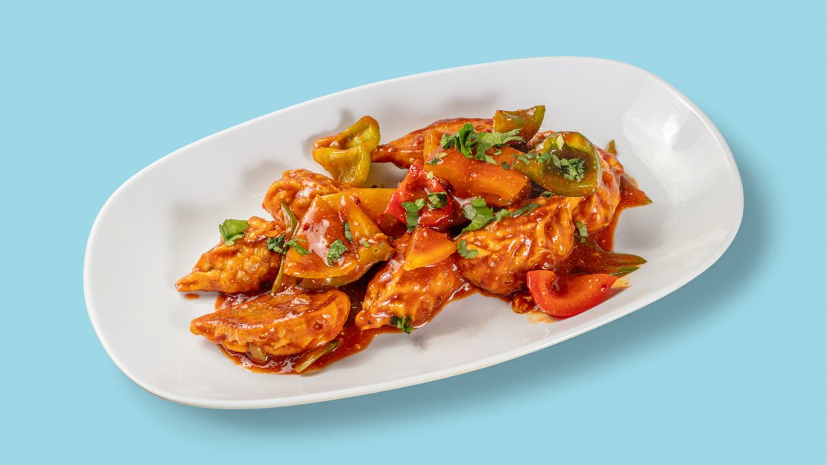 frittierte Momo-Teigtaschen, geworfen in einer würzigen, süß-sauren Chili-Soße