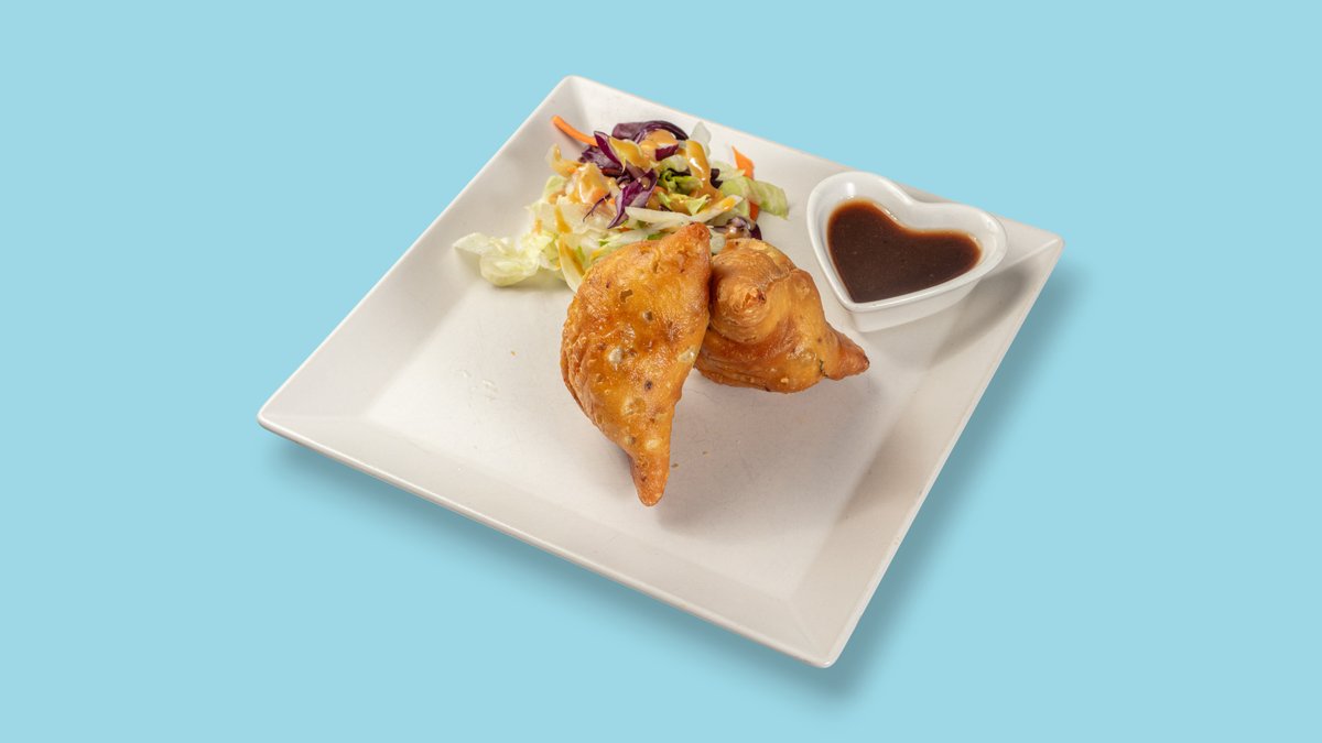 2 Stück knusprige Teigtaschen gefüllt mit gewürzten Kartoffeln, Erbsen und aromatischen Gewürzen