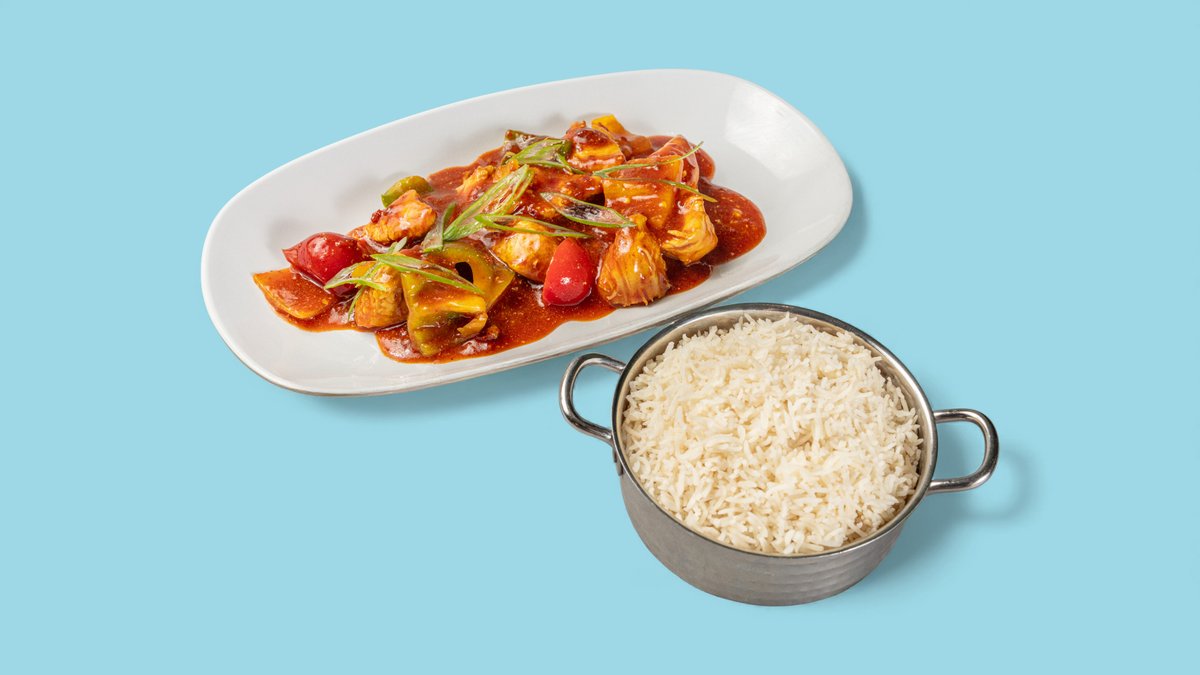 knusprig frittierte Hähnchenbruststücke in einer süß-würzigen Soße mit Paprika und Zwiebeln