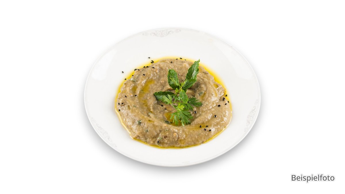 hausgemachter Auberginensalat, verfeinert mit Olivenöl, Knoblauch und Granatapfelkernen