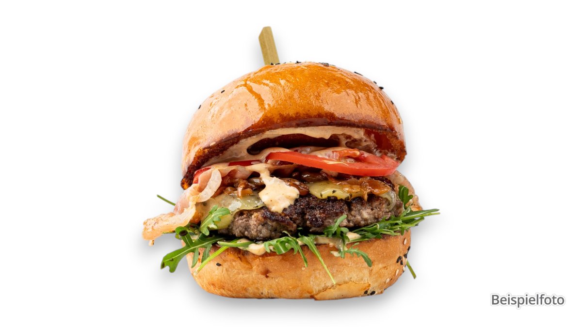 mit Rind-Patty, BarbecuesoĂźe, Onion Rings und Bacon vom Rind