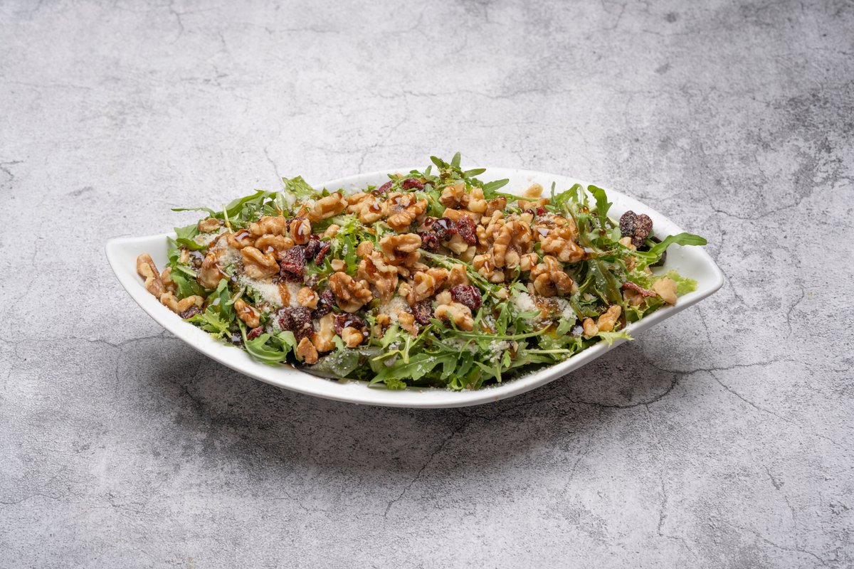 mit Rucola, Crannberry, Nüssen, Granatapfel-Soße und Oliven-Öl