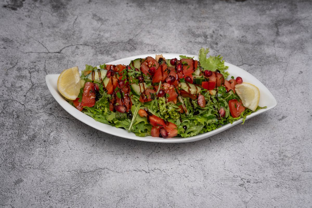 mit Köfte Patty, Salat, frischen Tomaten, Zwiebeln, Pastirma und Sher-Soße