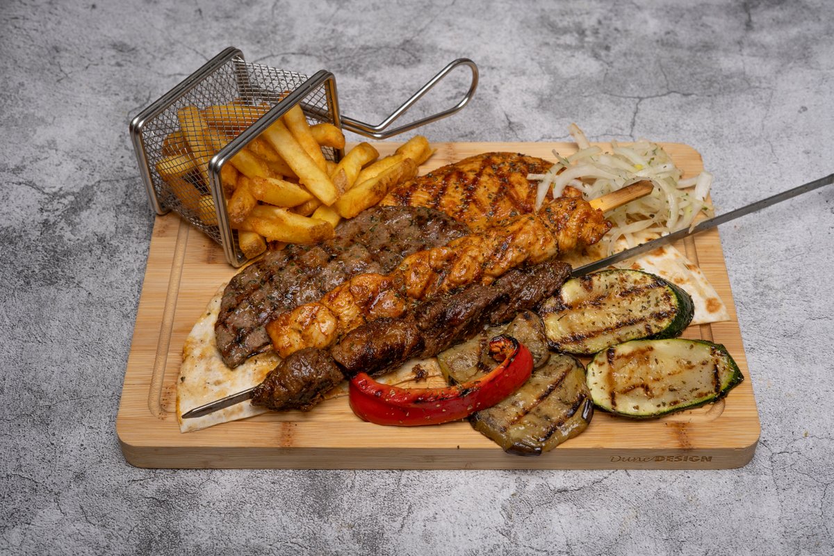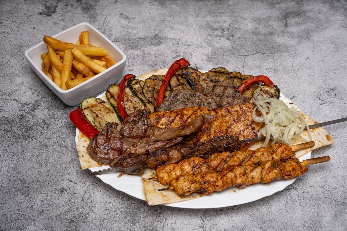 für 2 Personen 1x Rinder-Spieß, 1x Köfte-Spieß, 2x Hähnchenspieß, 2x Hähnchenbrust 2x Lamm Kotelétt und Brot