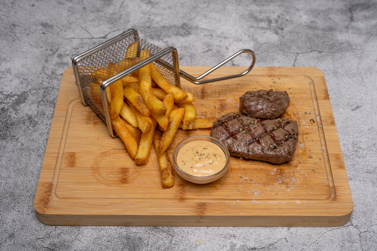 mit saftigem Burger aus Filet Steak-Rinder Filet, Cheddar, Speck, karamilisierten Zwiebeln und Sher-Soße