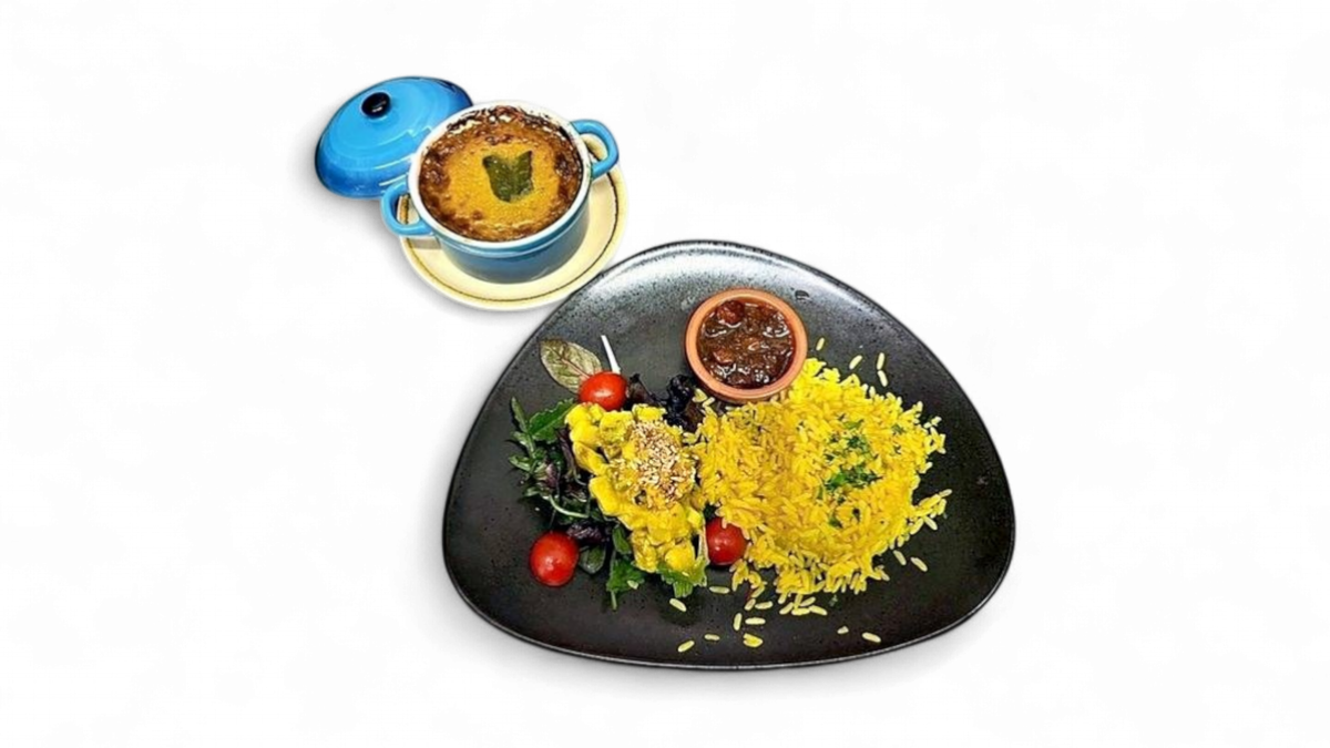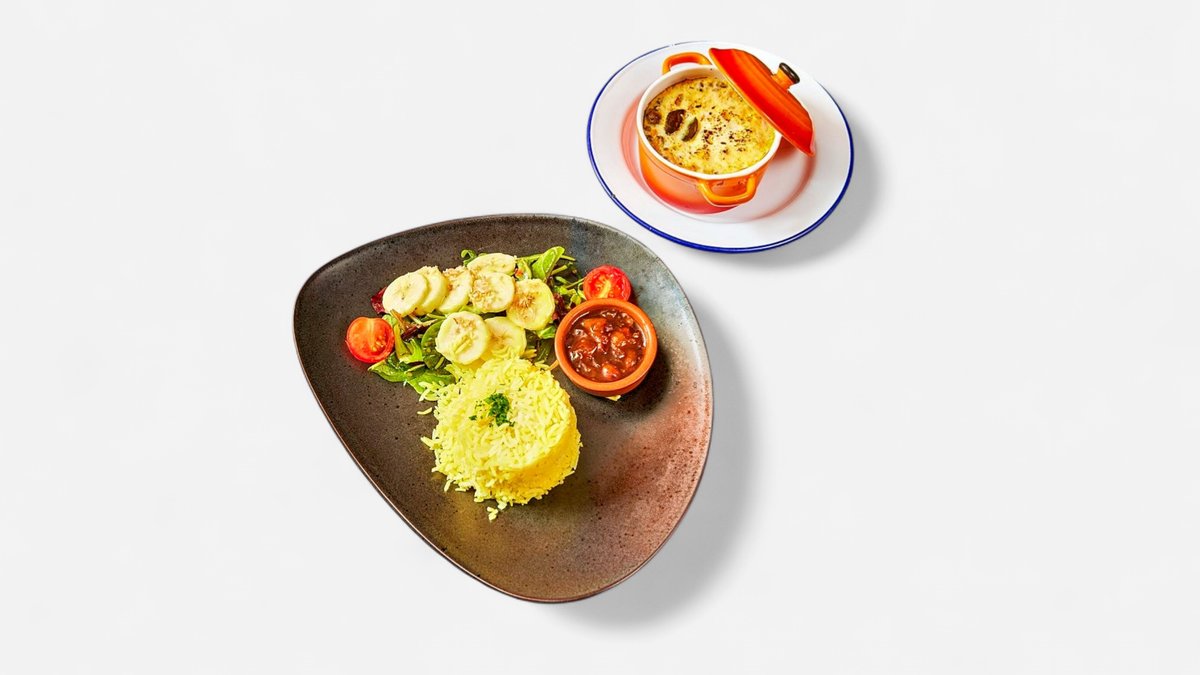 traditionelles Rinderhackfleisch mit Rosinen, Kurkuma Reis, Bananen-Baby-Blattsalat und Chutney