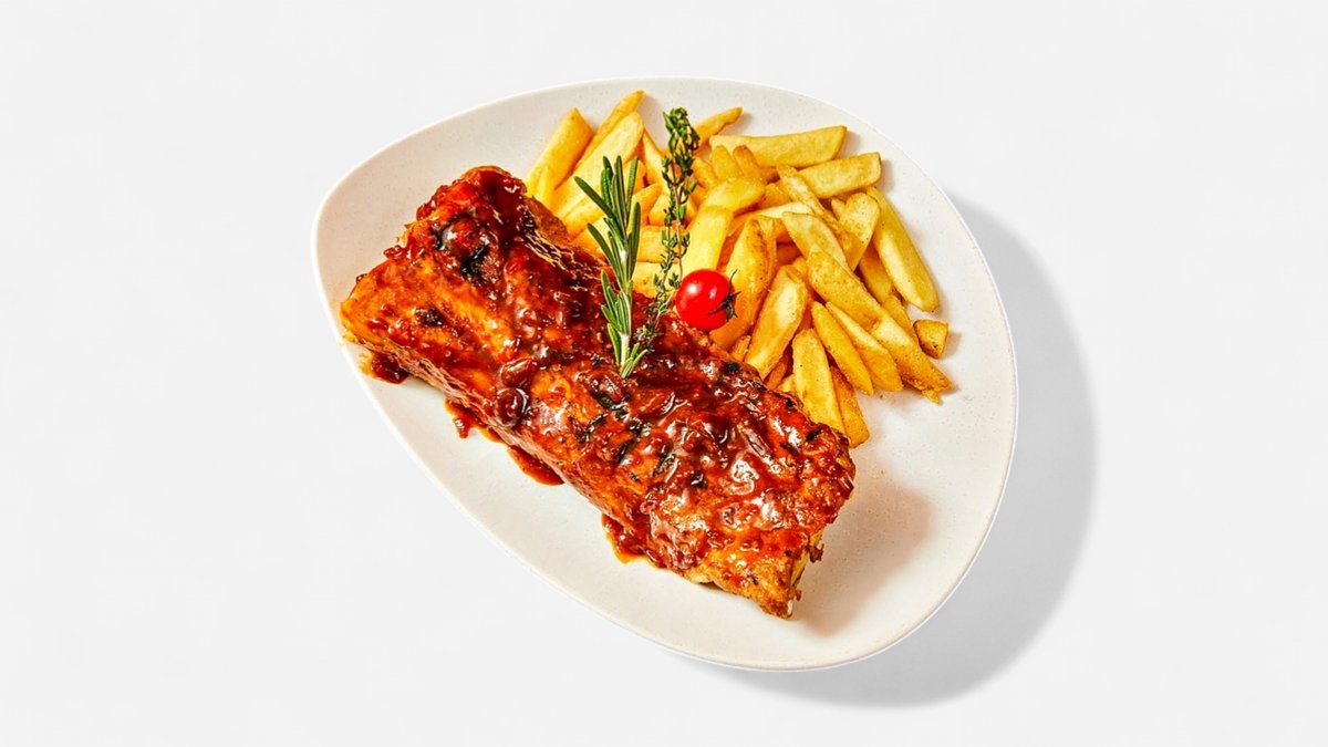 mit Schweinefleisch, Monkey Gland SoĂźe und dicken Pommes frites