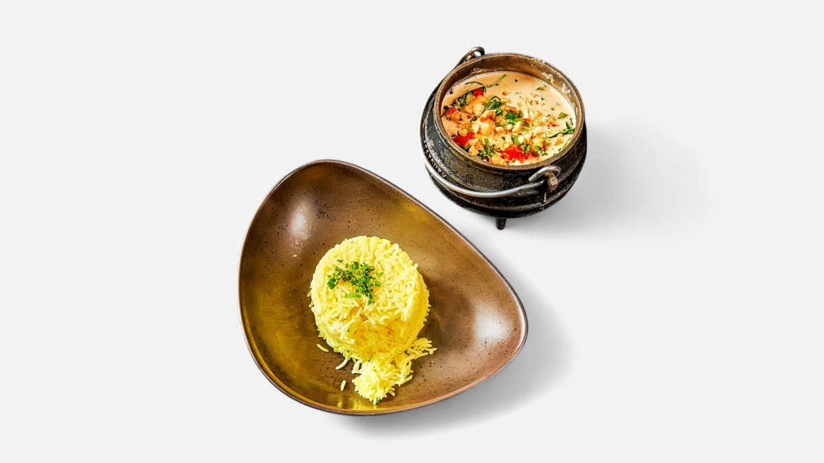 Curry-Eintopf mit SĂĽĂźkartoffeln, Spinat, grĂĽnen Bohnen und ErdnĂĽssen, serviert mit Kurkumareis