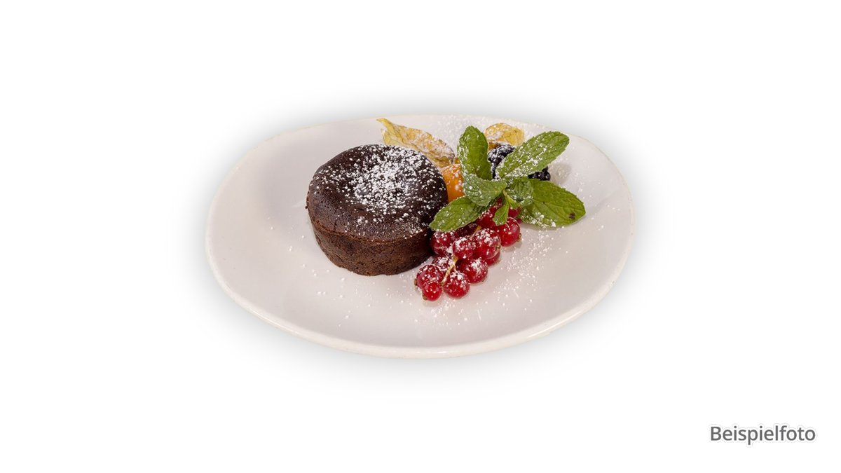 mit flüssigem Kern auf frischem Früchte-Mix mit Vanilleeis Das Gericht wurde mit Schokolade zubereitet und kann Spuren von verschiedenen Nüssen enthalten