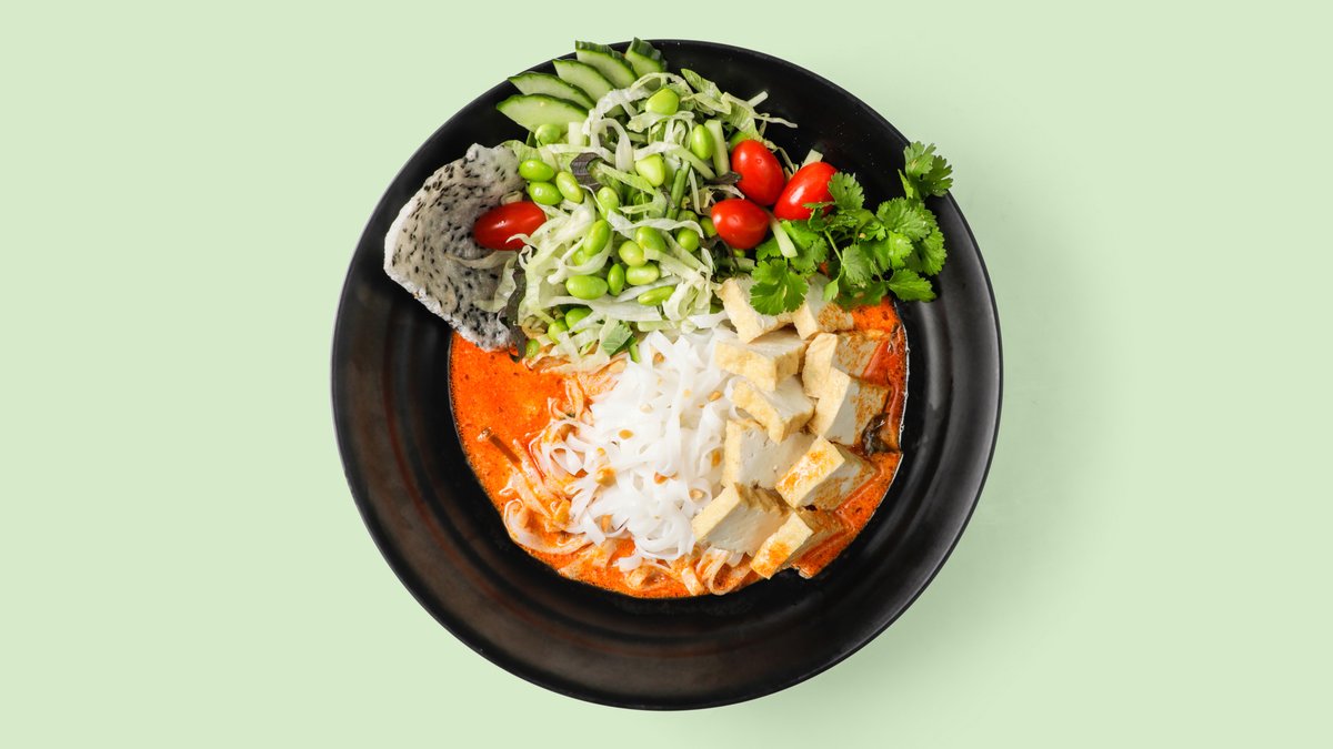 lauwarmen Reisnudeln mit Kräutersalat, knusprigen Sesamreis-Chips, übergossen mit verfeinerter Kokosmilchsoße