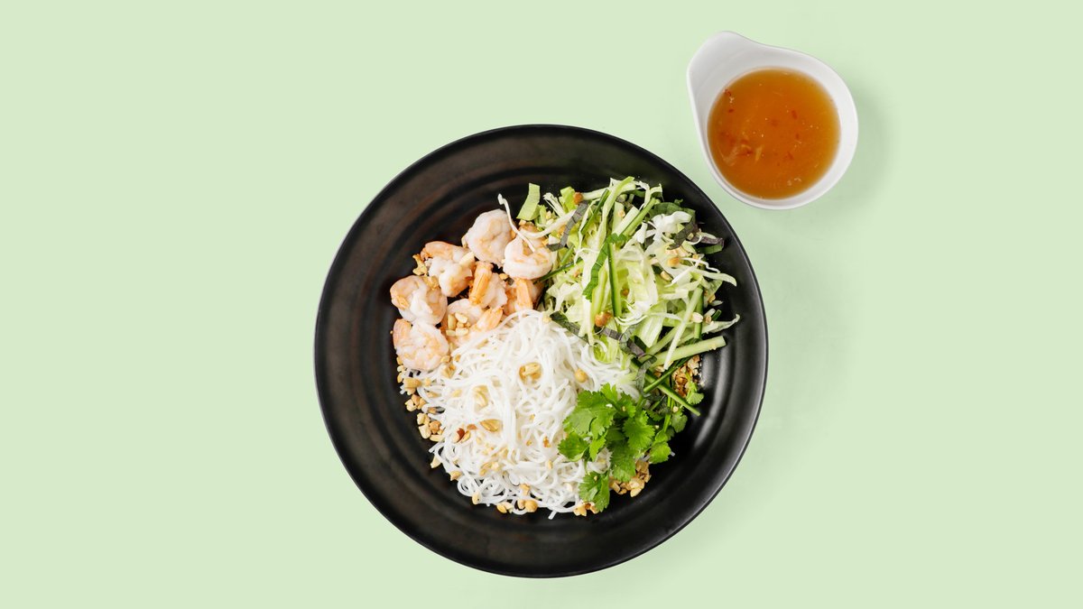 mixed lauwarmen Reisnudeln mit Kräutersalat, frischen Kräutern und Erdnüssen, serviert mit hausgemachter Fisch-Süß-Sauer-Soße