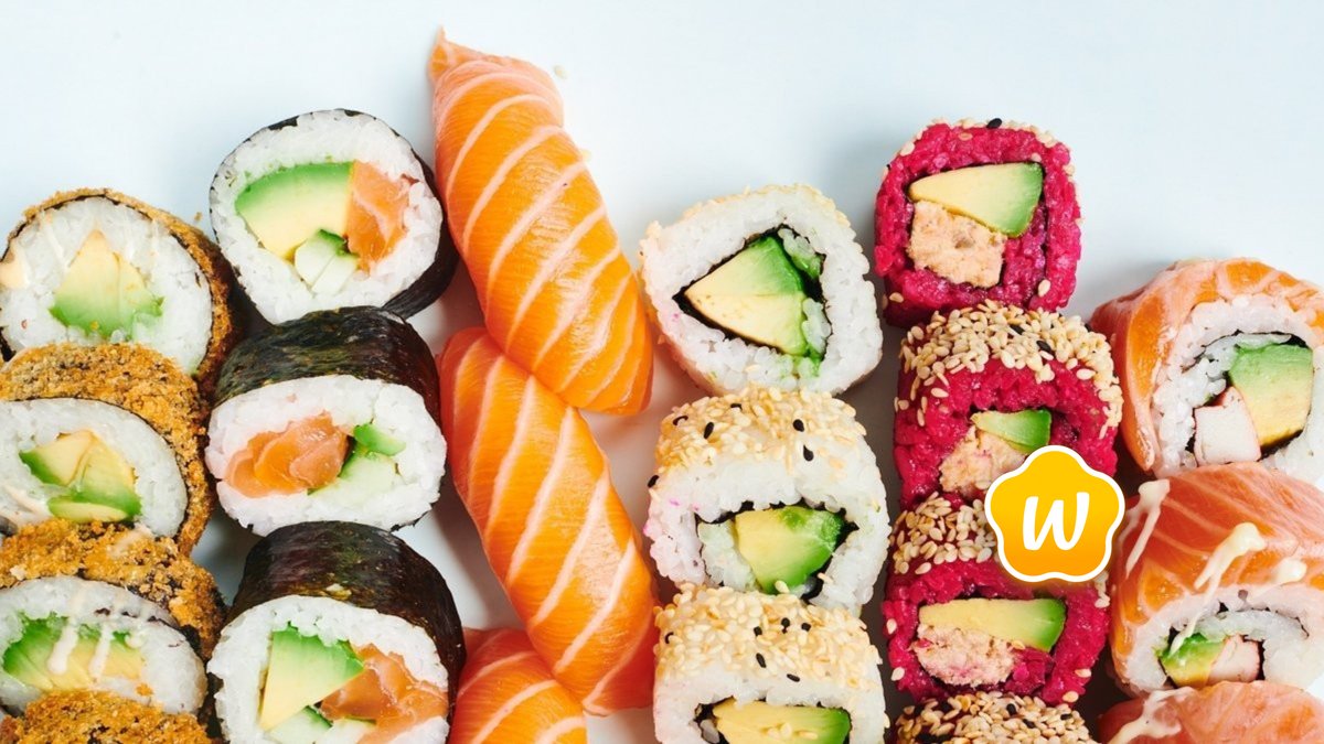 50 Stück 6x Mango Rainbow Roll (mit Avocado, Frischkäse, Lachs und Mango) 6x Lachs Rainbow Roll (mit Surimi, Avocado, Tamago und Lachs) 6x Avocado Rainbow Roll (mit Avocado, Lachs, Frischkäse und Gurken) 8x Surimi Avocado California Roll (mit Avocado, Mayonnaise, Surimi, orangen Fliegenfischeiern und Gurken) 4x Lachs Nigiri 4x Thunfisch Nigiri 4x Tilapia Nigiri 4x Ebi Nigiri 4x Gurken Maki 4x Avocado Maki dazu Sojasauce, Wasabi und Ingwer