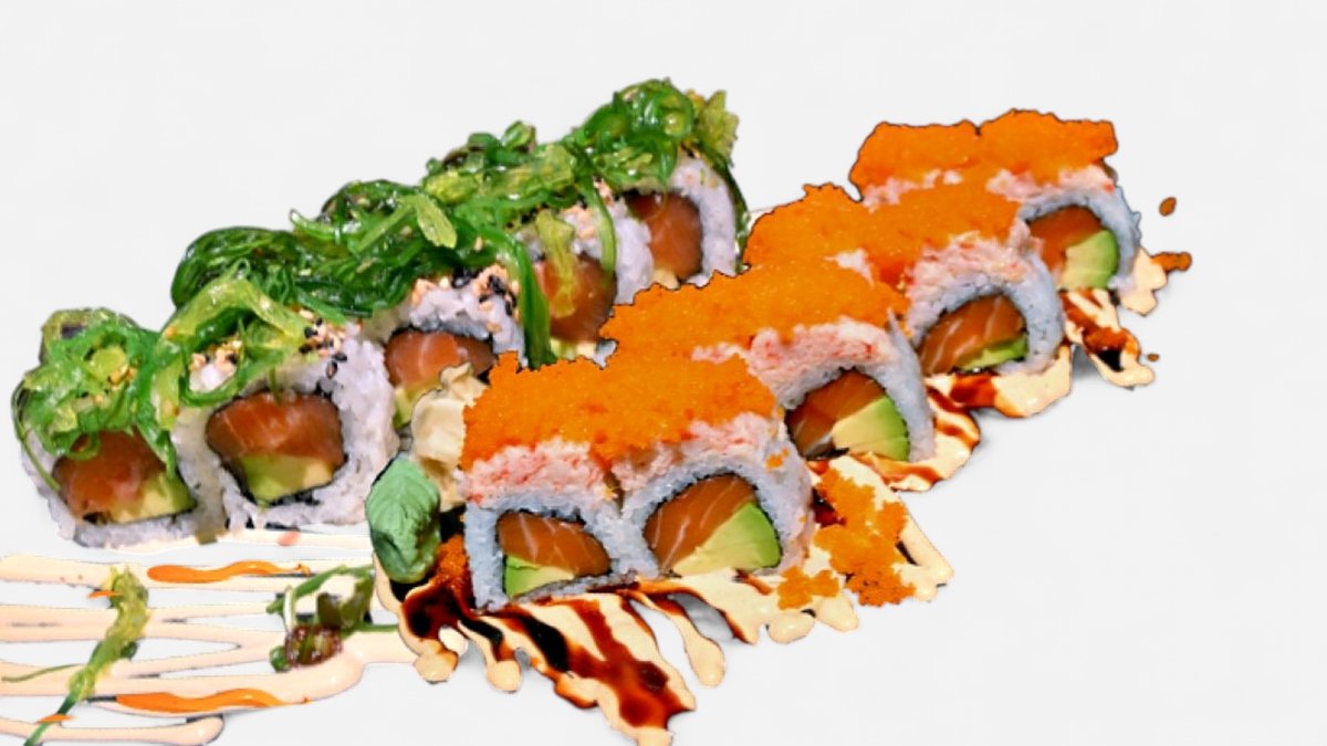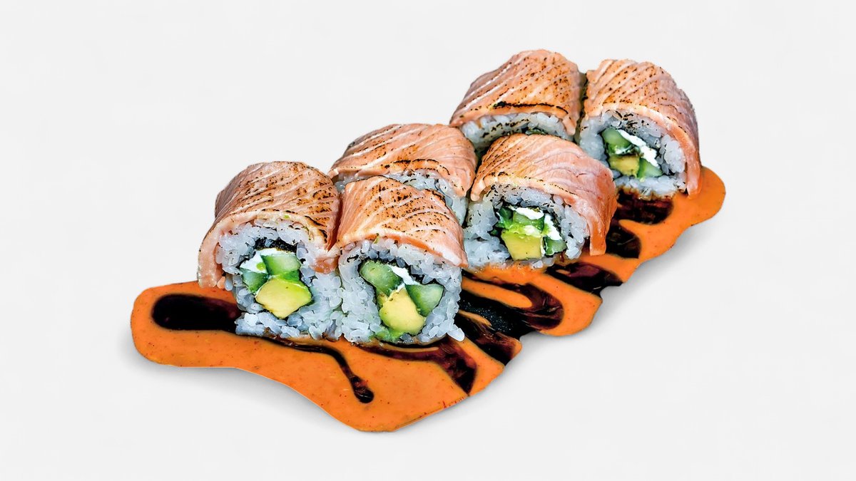 6 Stück Frischkäse, Gurke, Avocado, flambierter Lachs, Unagi- und Fancysoße Enthält Alkohol, für Kinder und schwangere Frauen nicht geeignet