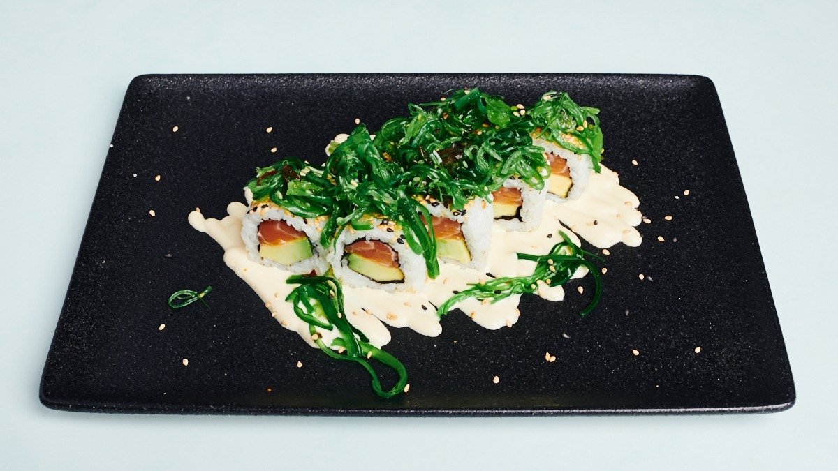 8 Stück Lachs, Avocado, Wakame-Algensalat und Mayonnaise