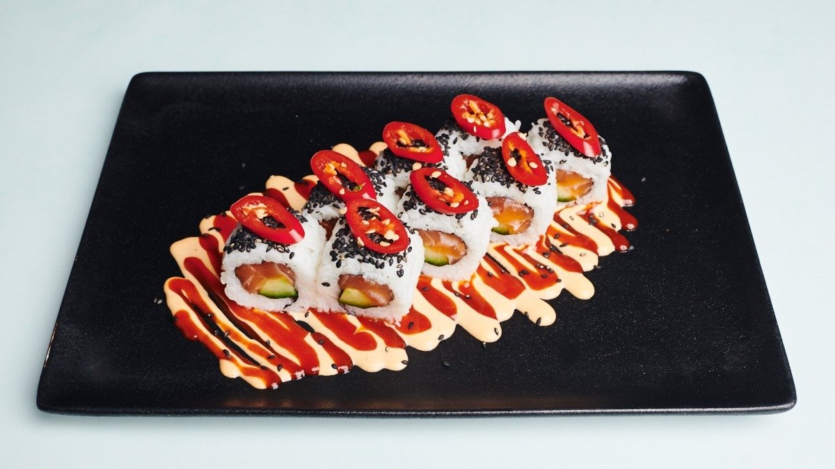 8 Stück Lachs, Gurke, Peperoni, Chilisoße und Chili Mayonnaise