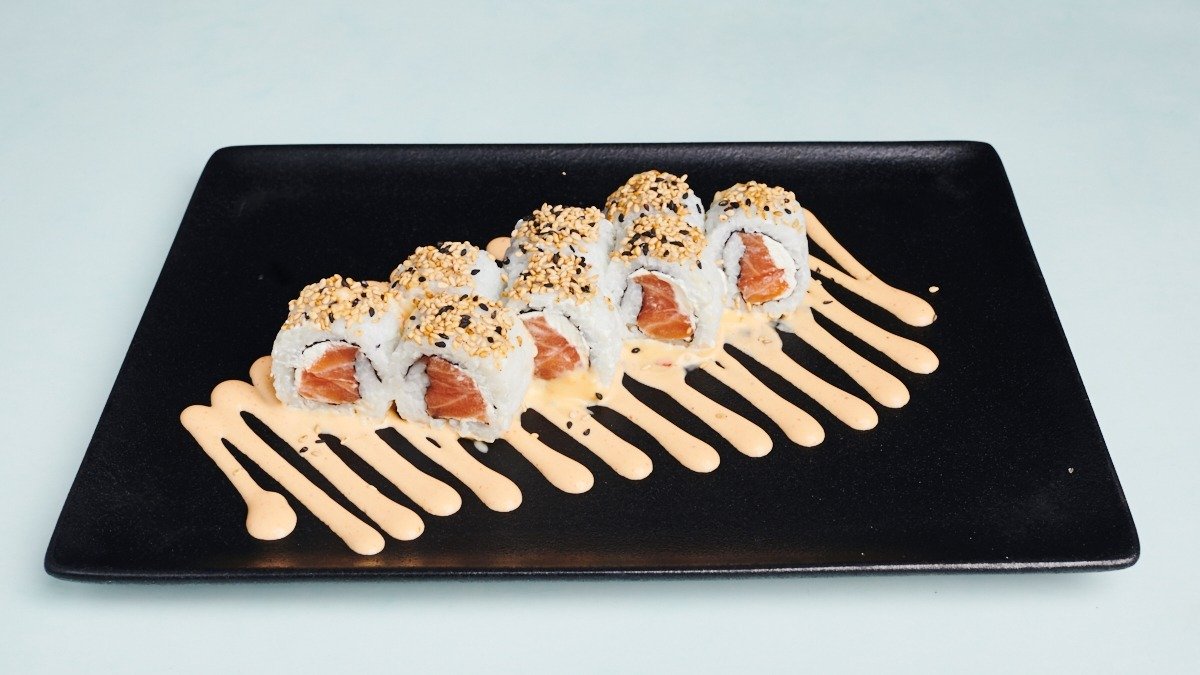 10 Stück, frittiert Lachs, Avocado, Masago, Tempurateig, Wasabi-Mayonnaise, Unagisoße und Frühlingszwiebel