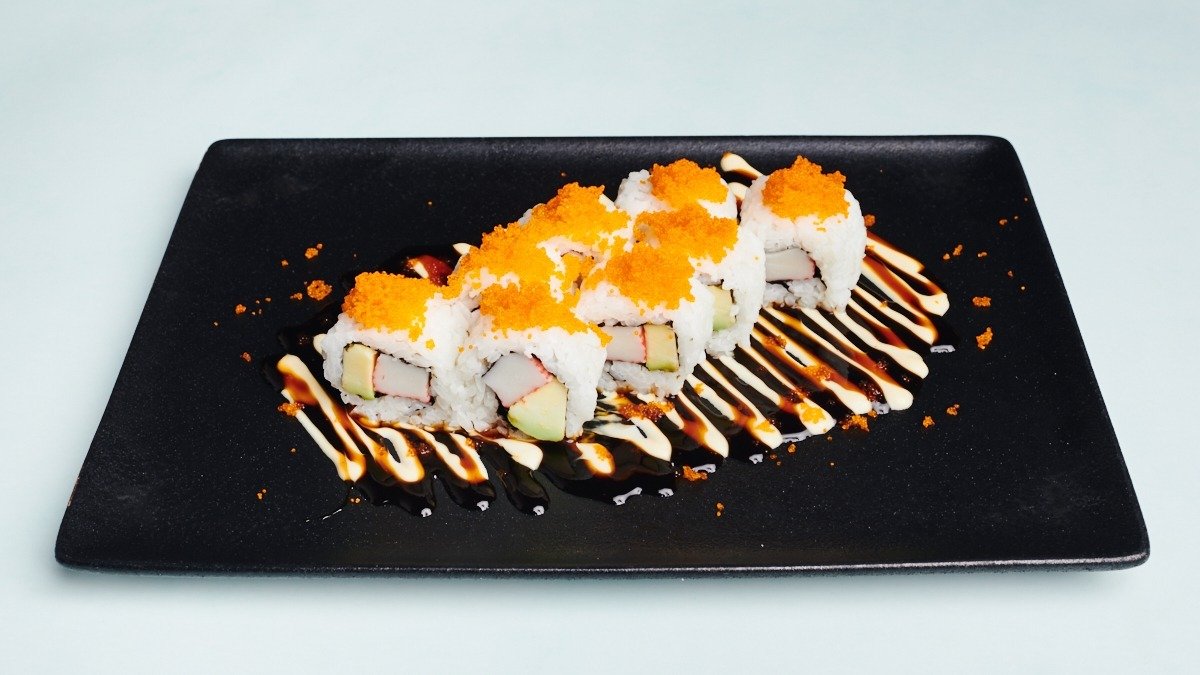 8 Stück Surimi, Avocado, Masago, Mayonnaise und Unagisoße