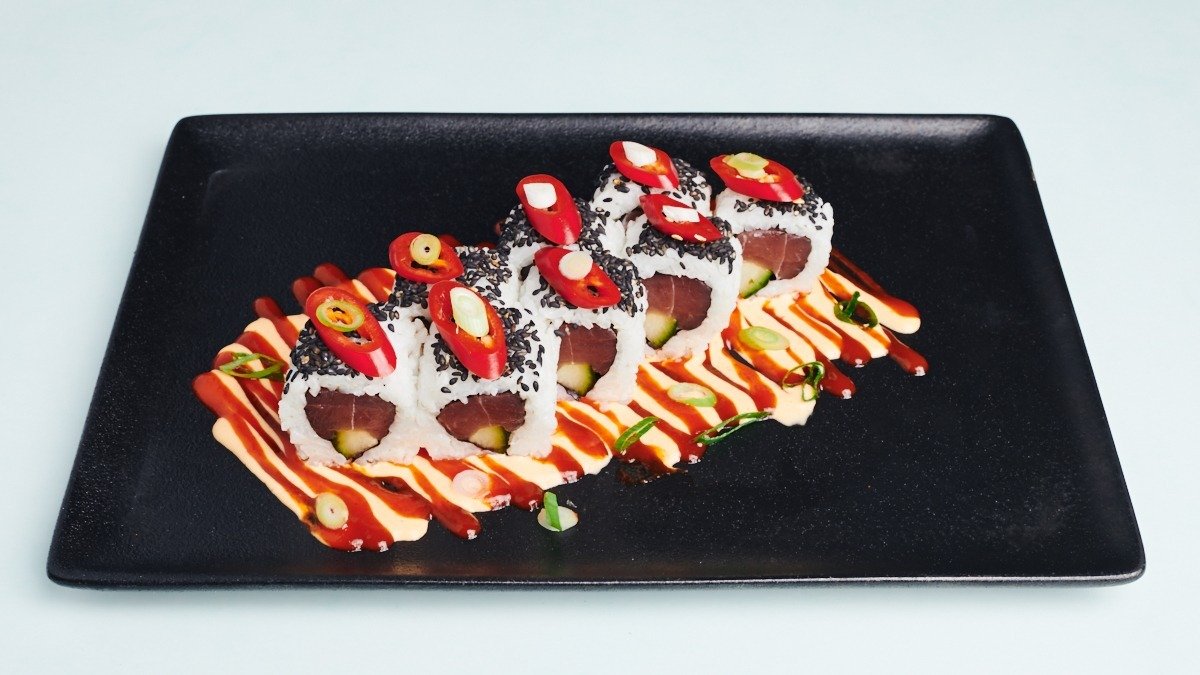 8 Stück Thunfisch, Gurke, Frühlingszwiebel, Peperoni, Chilisoße und Chili Mayonnaise