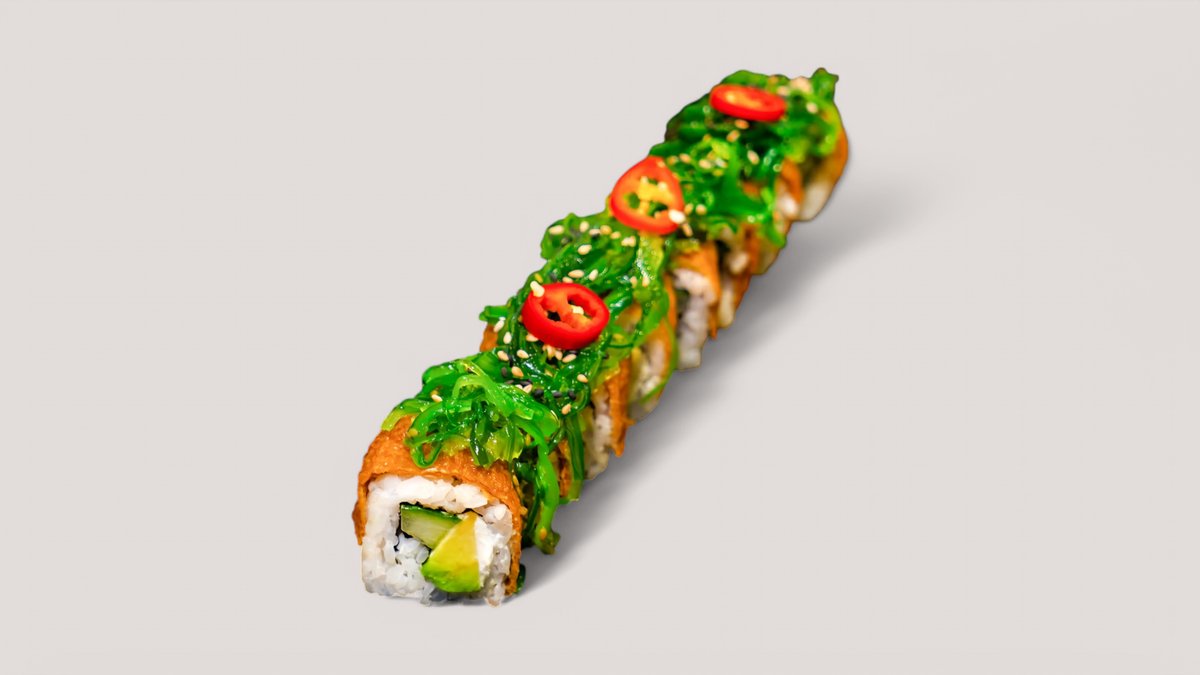 8 Stück Tofu, Avocado, Gurke, Frischkäse, Wakame-Algensalat, Peperoni und Wasabi-Sesamsoße