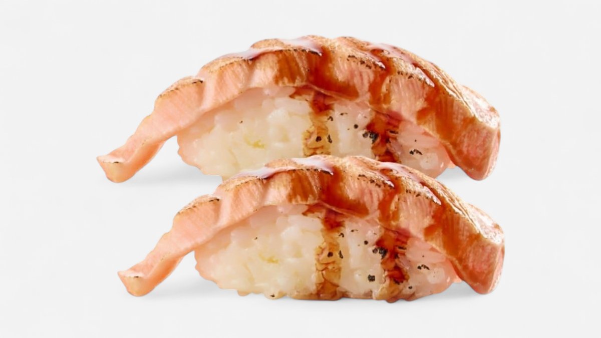 2 Stück mit flambiertem Lachs, Unagisoße und Sesam Enthält Alkohol, für Kinder und schwangere Frauen nicht geeignet