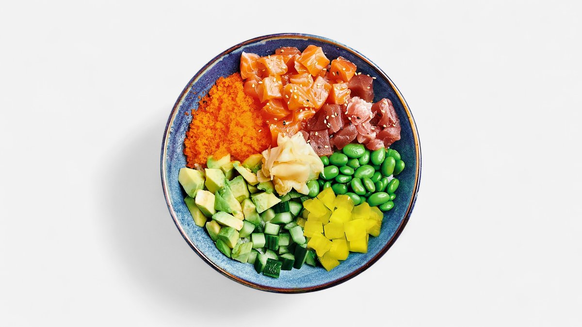 Reis mit mariniertem Lachs und Thunfisch, Gurke, Rettich, Avocado, Edamame, Masago und Sesamsoße