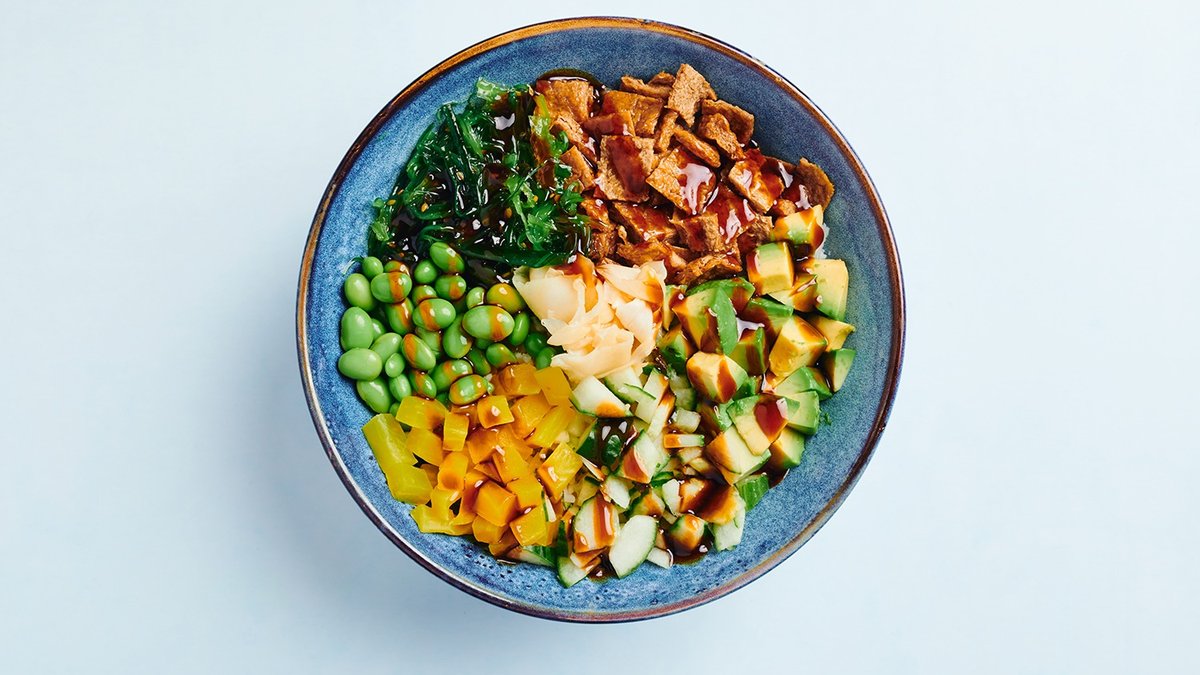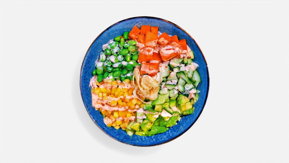 Reis mit mariniertem veganen Lachs, Mango, Gurke, Edamame, Avocado, Chili-Mayonnaise und Sesamsoße
