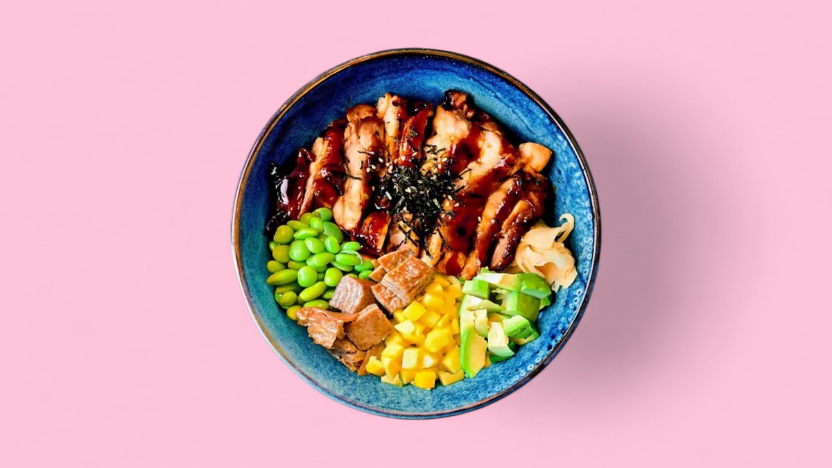 Reis mit Chicken Teriyaki, Avocado, Edamame, Tofu, Mango, Teriyaki- und Sesamsoße