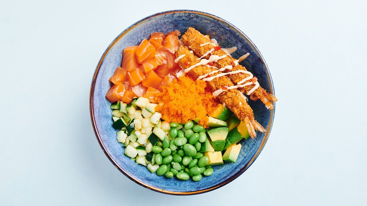 Reis mit zwei Crispy Shrimp-Tempura, mariniertem Lachs, Avocado, Edamame, Zucchini, Masago, Sesamsoße und Sweet Chili-Mayonnaise