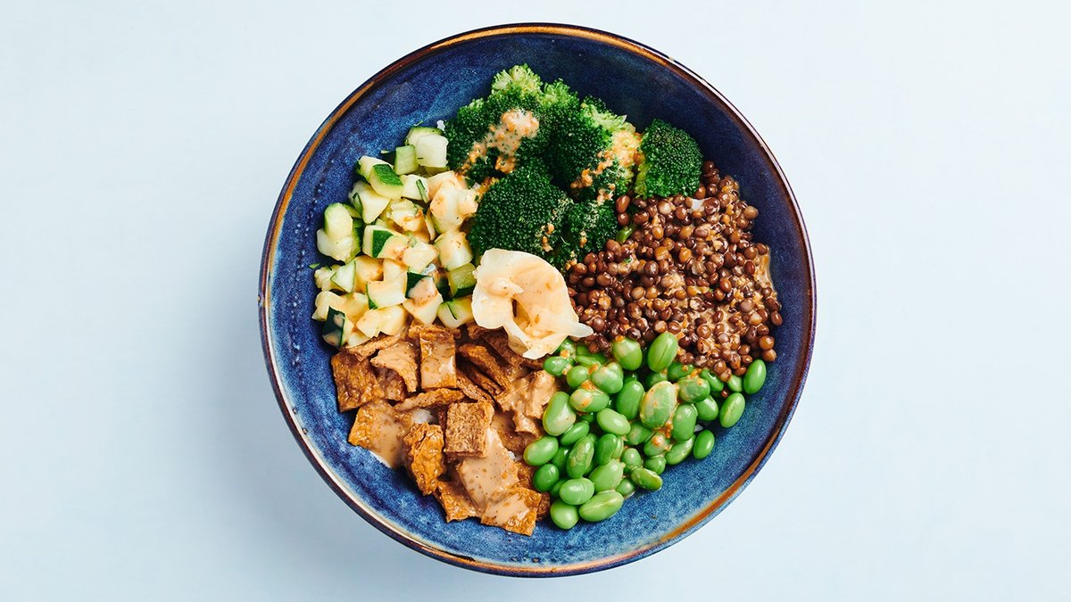 Reis mit Tofutasche, Edamame, Zucchini, Brokkoli, marinierten Linsen und Sesamsoße