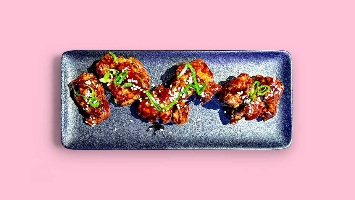 frittiertes Hühnchenfleisch mit Teriyaki-Soße, Frühlingszwiebeln und Sesam