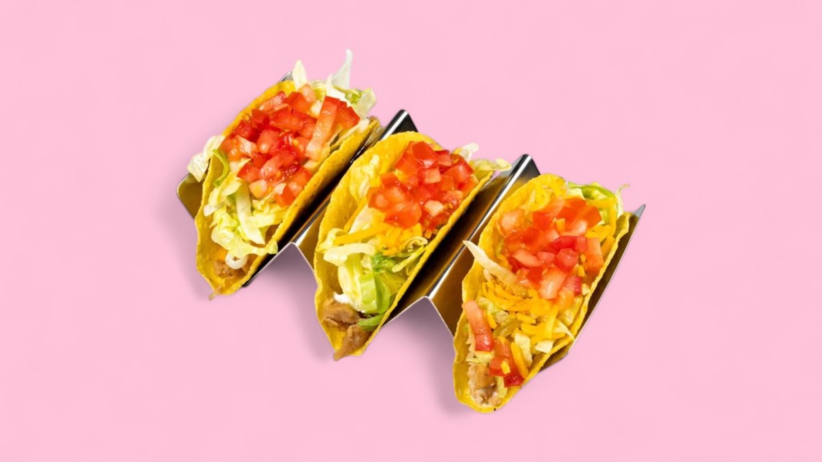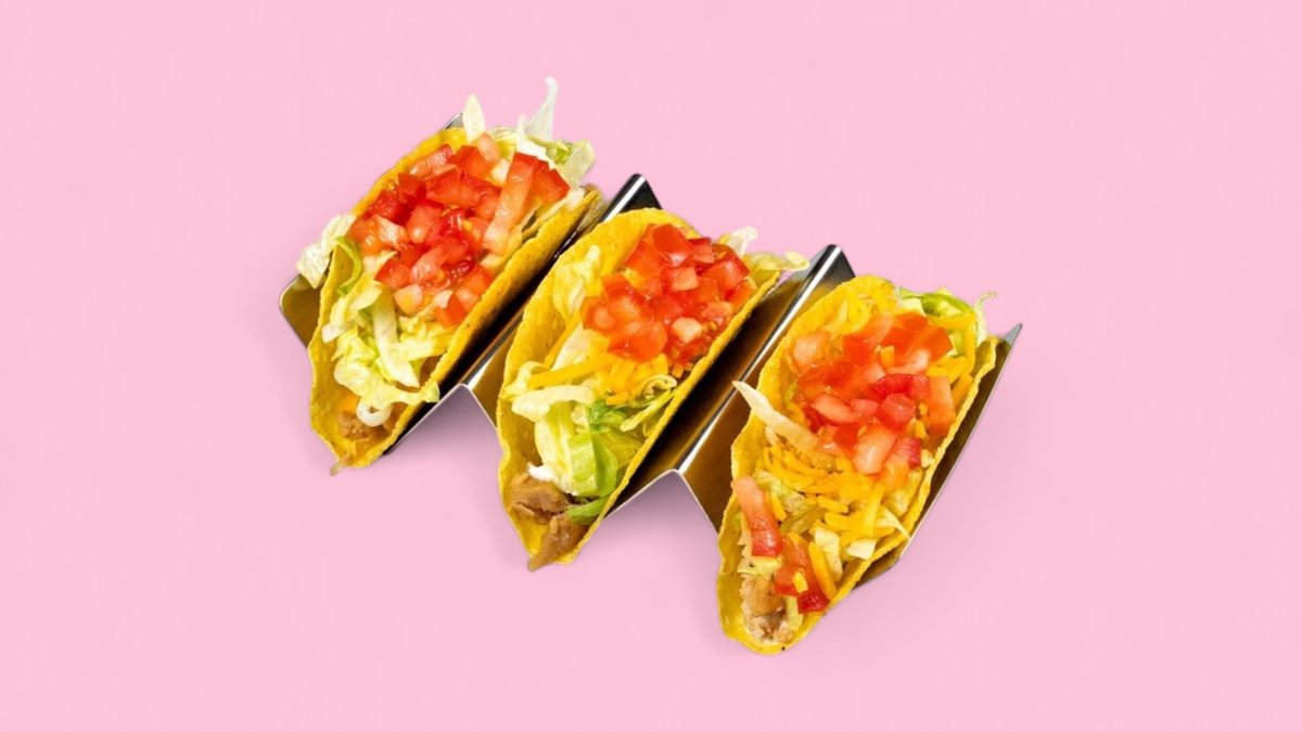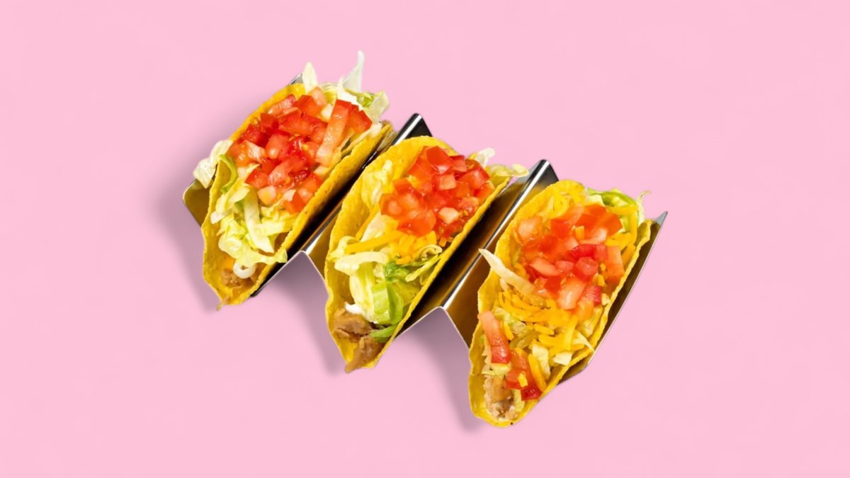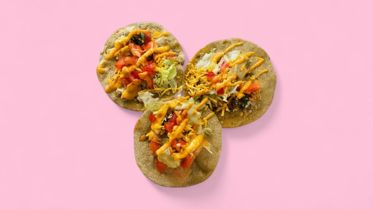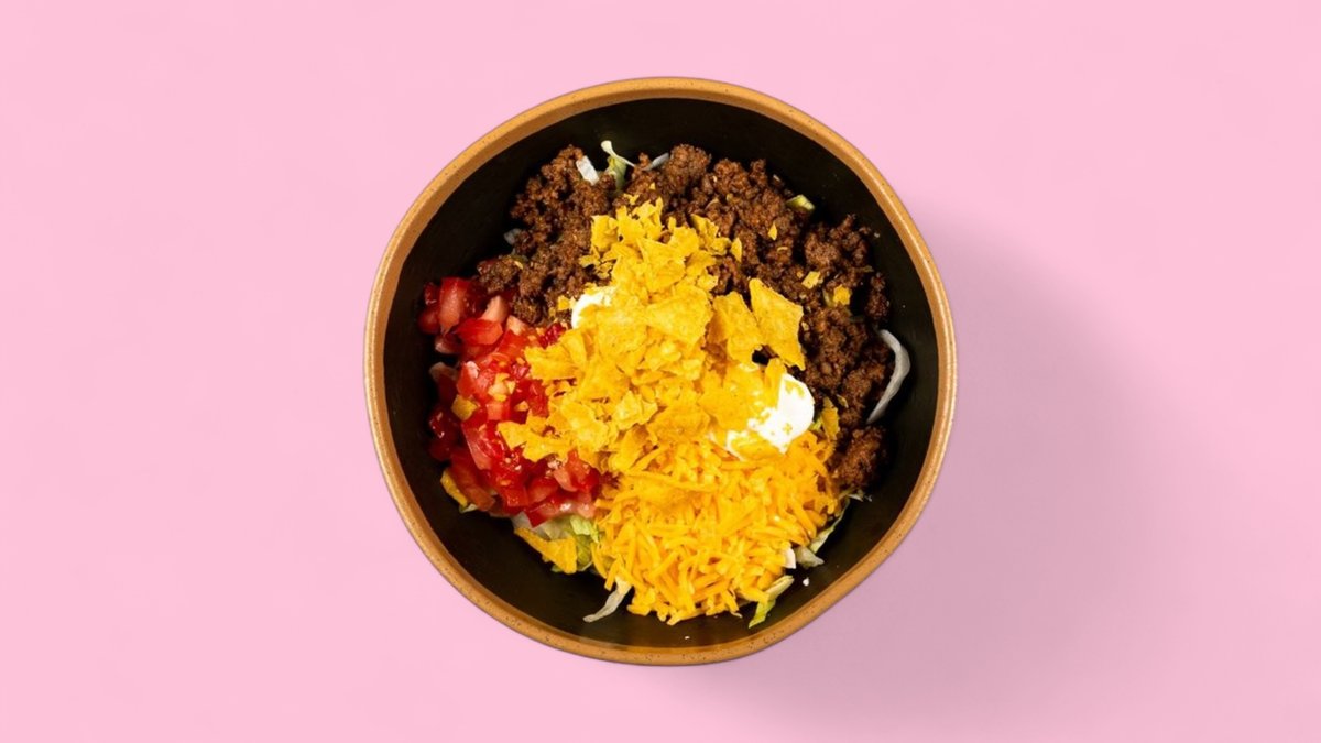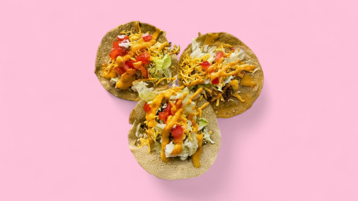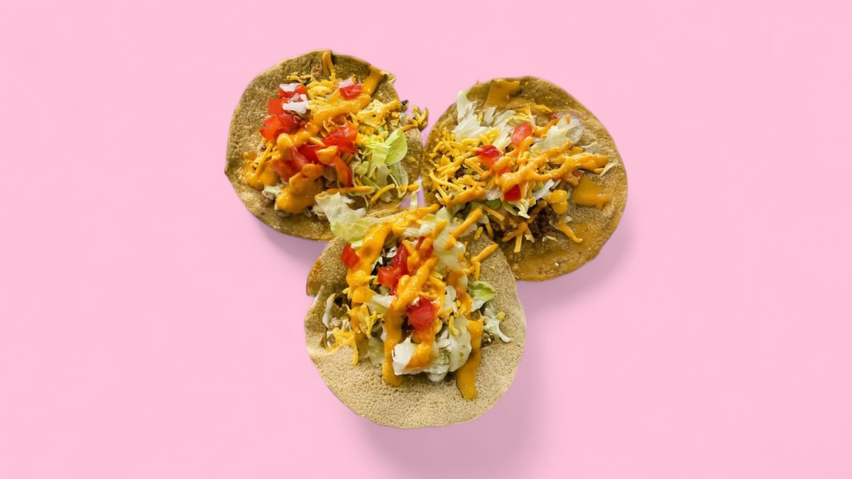 mit 100% Bio Rinderhackfleisch, Nixtamal Tacos, Eisbergsalat, Tomatoes, Cheddar and Chili Dressing plus Lime