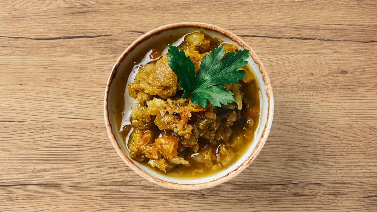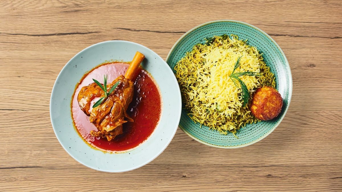 mit fein gehackten frischen Kräutern (Spinat, Petersilie, Koriander, Schnittlauch und Bockshornklee), zart gegartem Rindfleisch und Kidneybohnen, verfeinert mit getrockneten Limetten, serviert mit edlem Basmatireis und Safranhaube