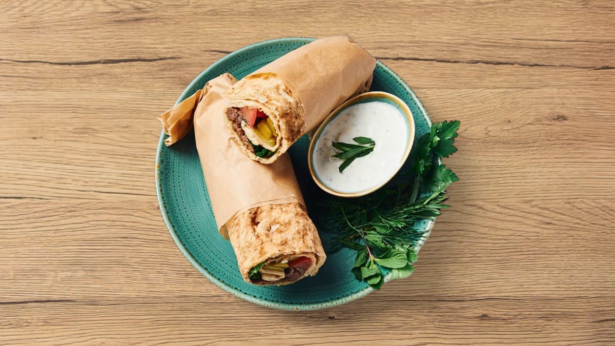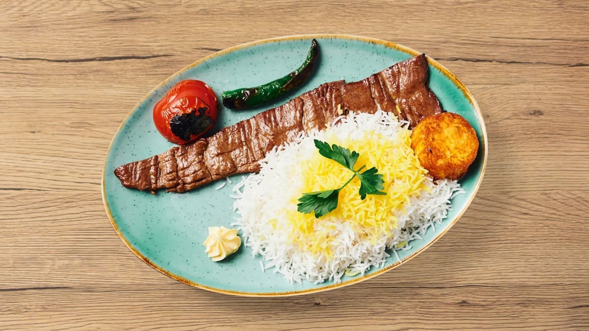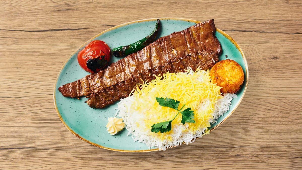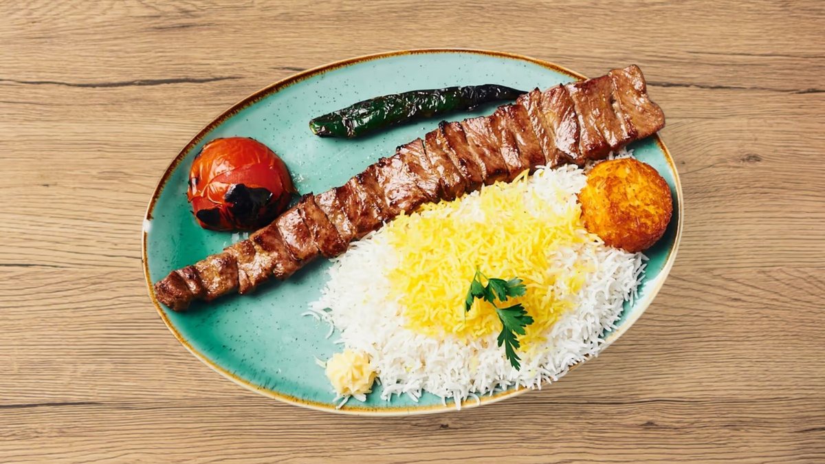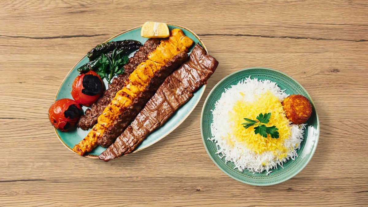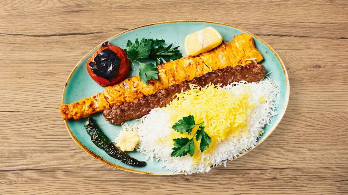 zwei feine Grillspieße aus gemischtem Rinder- und Lammhackfleisch, serviert an hausgemachtem dünnem Fladenbrot, frischen Kräutern (Minze und Basilikum), persischen Salzgurken, Tomatenscheiben und Mast-o-Khiar Schälchen