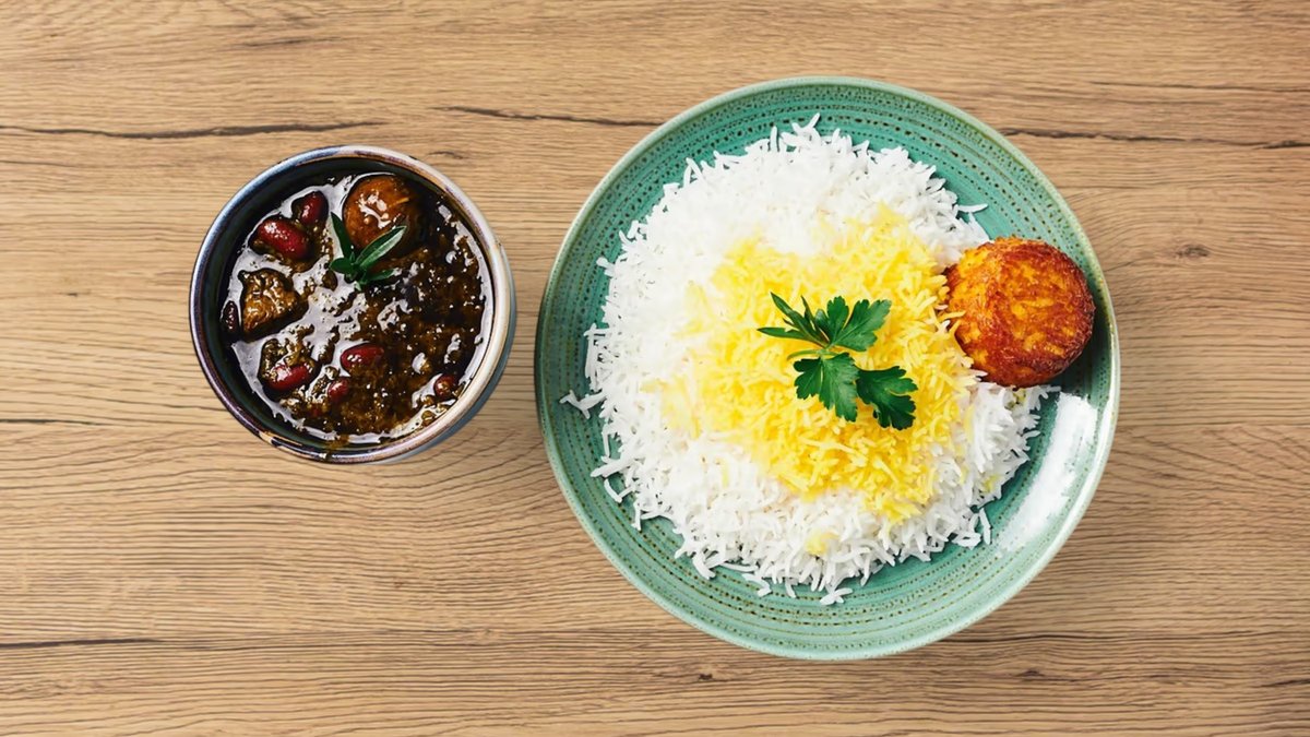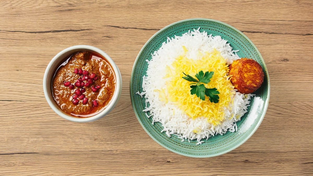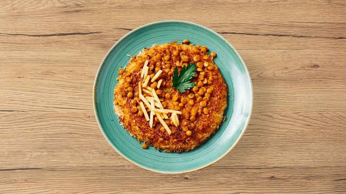 persische Reiskruste mit Gheymeh (Schmorgericht mit gelben Platterbsen und einer leichten tomatisierten Soße)
