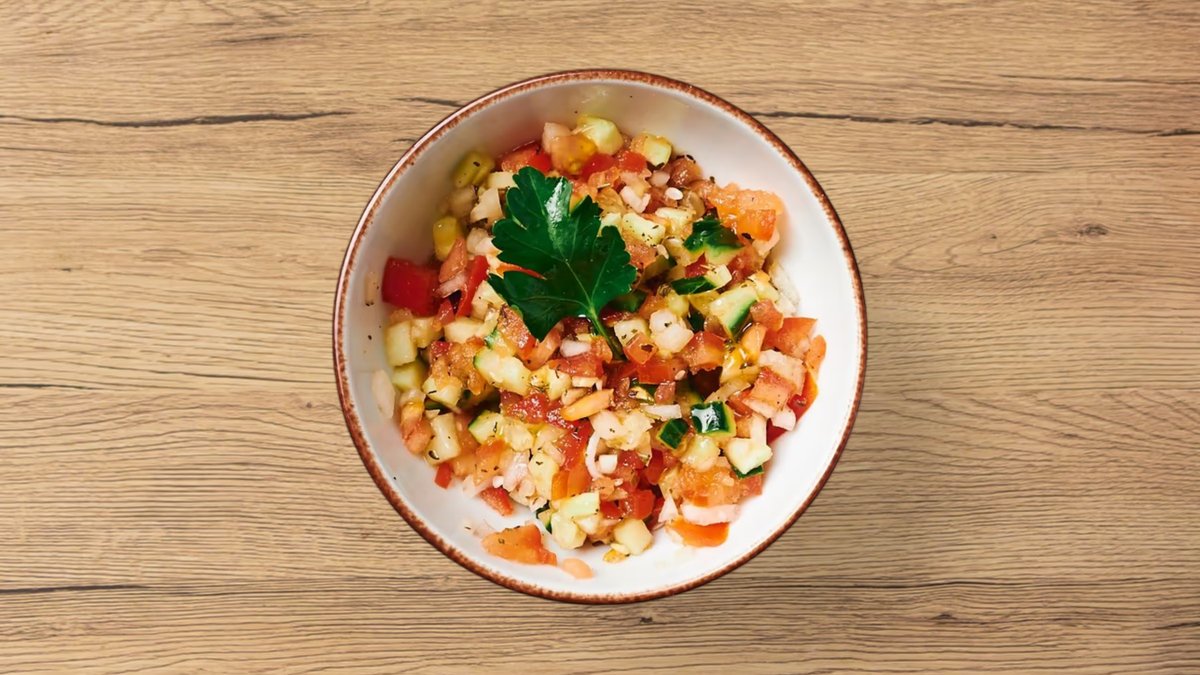 fein geschnittene Tomaten, Gurken und Zwiebeln verfeinert mit getrockneter Minze, Limettensaft und Olivenöl