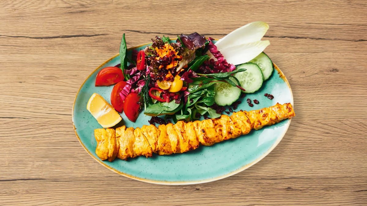 bunter Salatteller mit in Safran-Limette marinierten Hähnchenbrustfiletstücken vom Grill, Berberitzen, Granatapfelkernen und Walnüssen