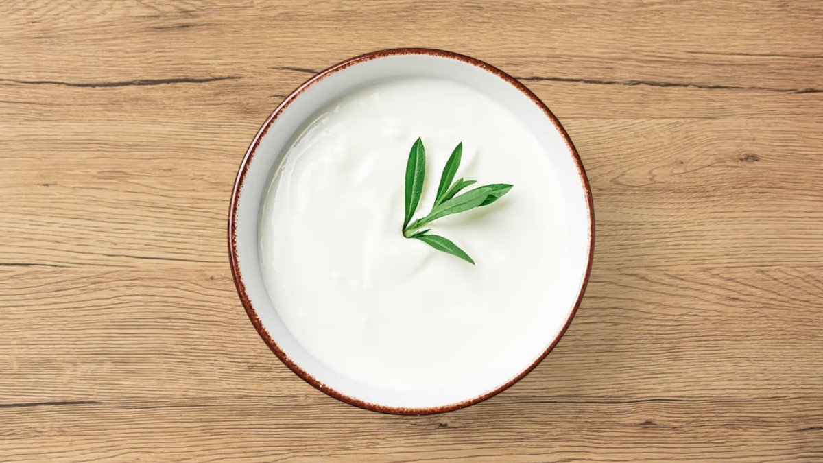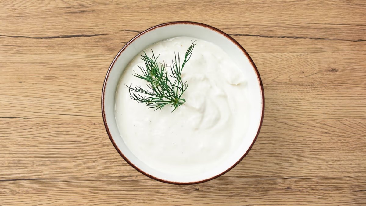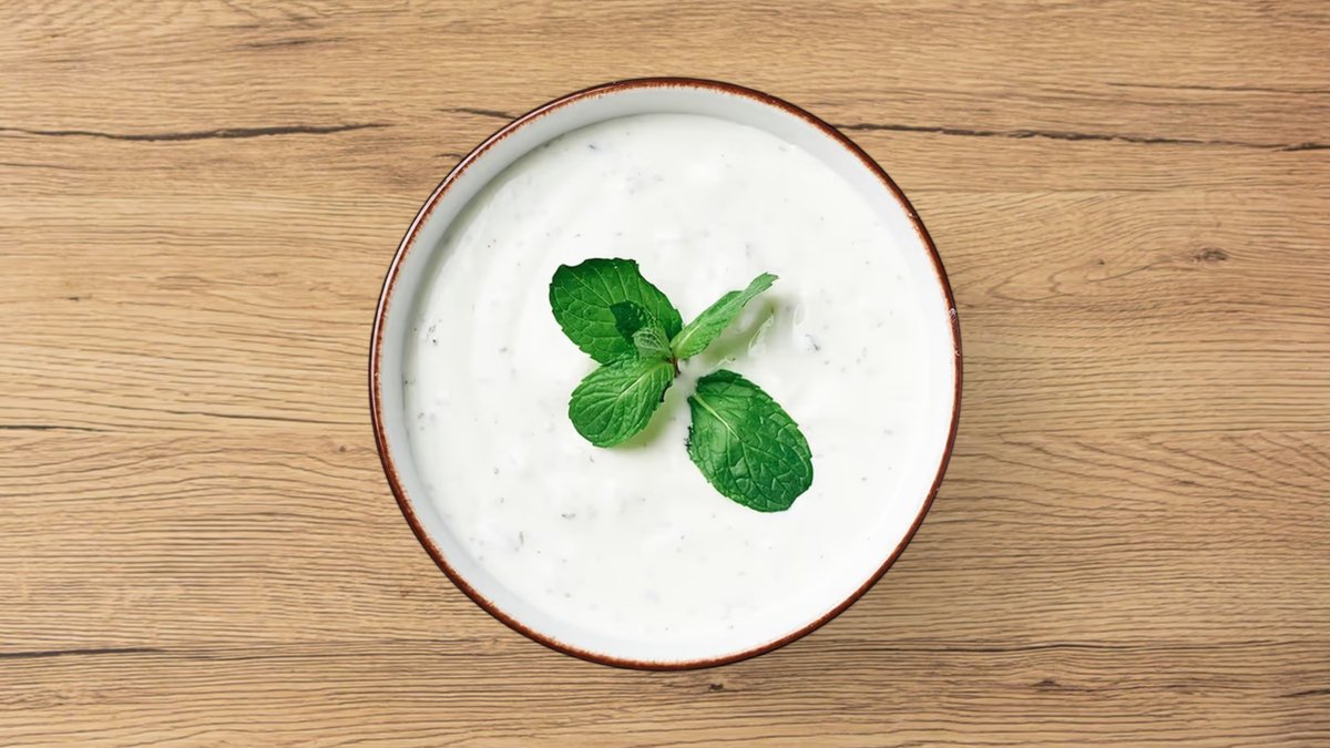 Joghurt mit Gurkenstückchen, verfeinert mit getrockneter Minze