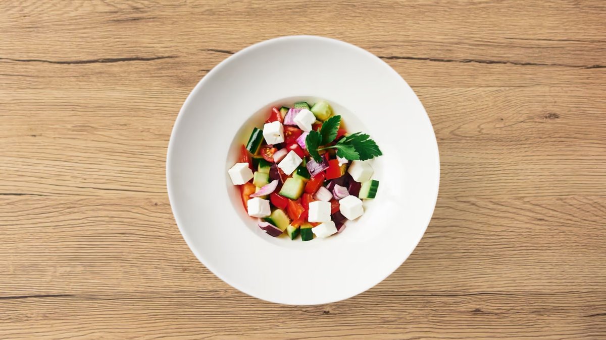 grob gewürfelte Tomaten, Gurken und Zwiebeln mit Schafskäse