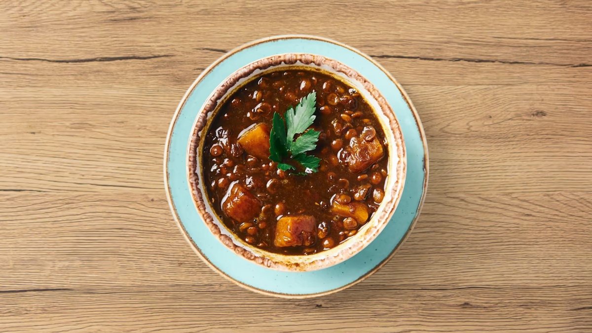vegan Linsen mit Kürbisstückchen in einer feinen Soße aus Granatapfelmark und Zimt, serviert mit hausgemachtem Brot
