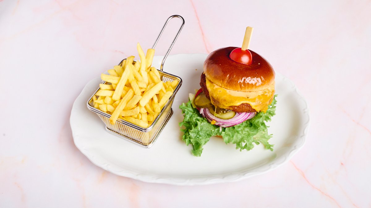 GemĂĽsebratling, rote Zwiebeln, hausgemachte BurgersoĂźe, Cheddar, Salat, Gurken, Tomaten und Pommes frites