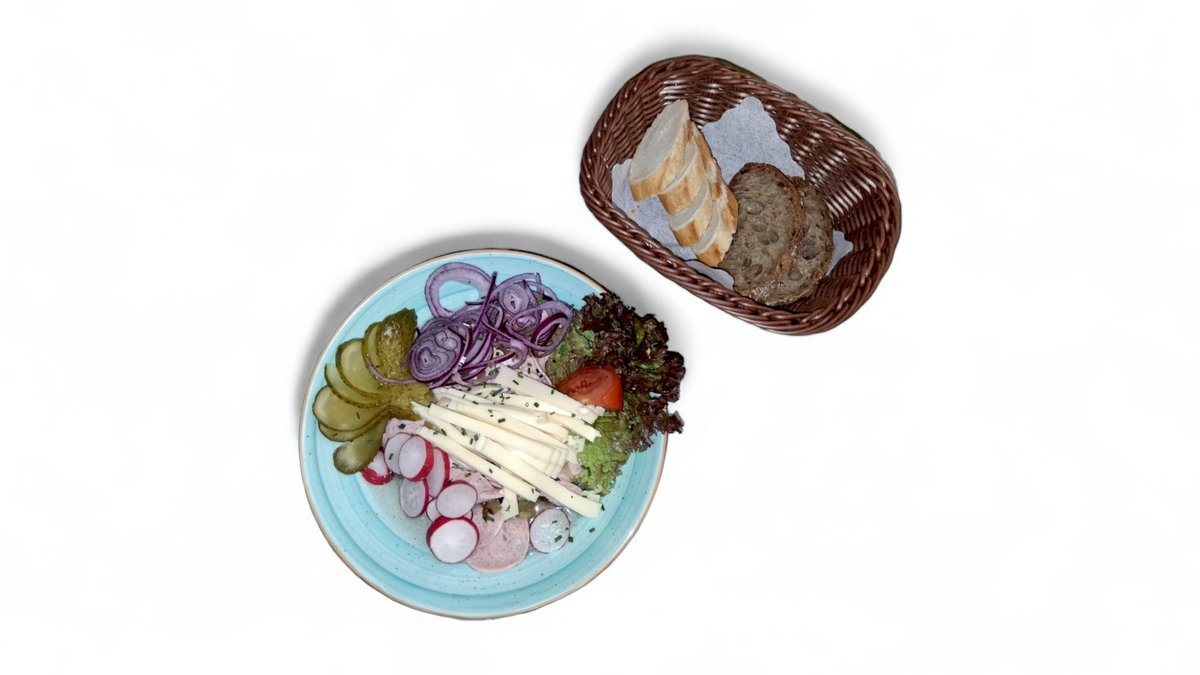 alle Gerichte werden mit roten Zwiebeln, Essiggurken und Wurzelbaguette zubereitet