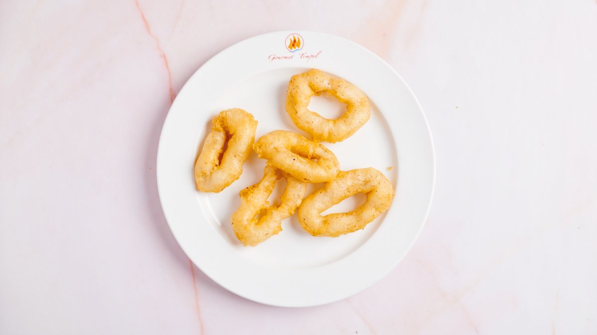 mit panierten Garnelen, Tintenfisch, Fisch, Gemüse und separater Süß-Sauer-Soße